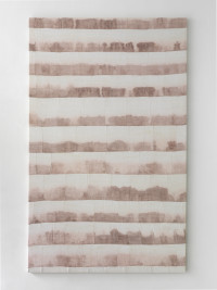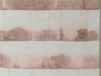 Several lands and time periods get combined in “Kasbah, 2022“ which is a development of her iconic Saline series. The textile is french linen from the 19th century woven near Marseille. On one part the original embroidered red initials from the previous owners are still visible. The beige-rose colour comes from several dippings in a mixture of Terracotta that Farah has collected from Cabo Bojador in Western Sahara and rust from an area called „Vinterviken“ close to central Stockholm. Each patch has been dipped individually. The “Mountainous Landscape” comes from Farahs complex dipping technique which is based on the fact that the rust was suppressing the terracotta to the ground of the dipping vessel. The subtle yellow lines derive from the evaporation of the water during the drying process. The composition s play with environmental impressions bases on the idea of a „repetitive still frame“, as seen in a moving image. However Farah‘s repetitions show differences that alludes to co-existing times, places, histories and geologies.