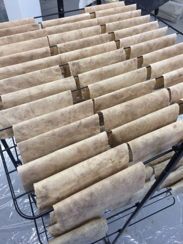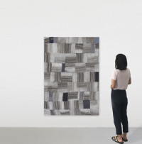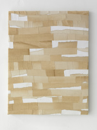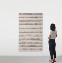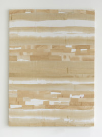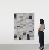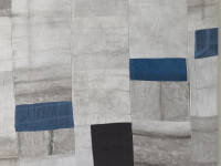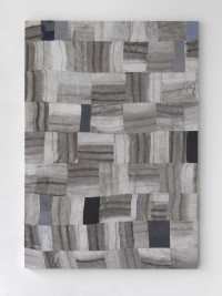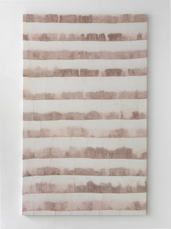 Ayan Farah's paintings are produced within a cycle of material production and reclamation. Informed by the history of landscape and land art in formal and material sense respectively, these works are formed by the place the pigments are sourced and it‘s geology. Often reflecting on personal history, the geographical location of the source material and the place of production are key. Socio-cultural concepts and geological properties as well as the aspect of mobility as part of the production process drives from Farah‘s own biography. Travels to places like Abu Dhabi, China, Somalia, or Mexico are essential parts of Farah’s work. Her “paintings” are never painted on canvas with brushes or produced with the usual work materials, but consist of historical textiles of the past centuries “treated” with the minerals and earths of the most various geographical locations, which Farah collects herself on site during her travels. Ayan Farah’s paintings are soaked, painted or dyed with natural pigments, mud, ash, clays and plant dyes found in different countries. Made of antique linen and jute, these works start as one large solid work, the off-cuts later becoming the patchworked pieces of Farah‘s future paintings. Sometimes these historic fabrics have endured so much wear and tear due to their nature as domestic linen, their only use is as part of a patchwork painting. All materials in her studio are reclaimed and saved for later, often re-dyed, re-stitched to form new works.