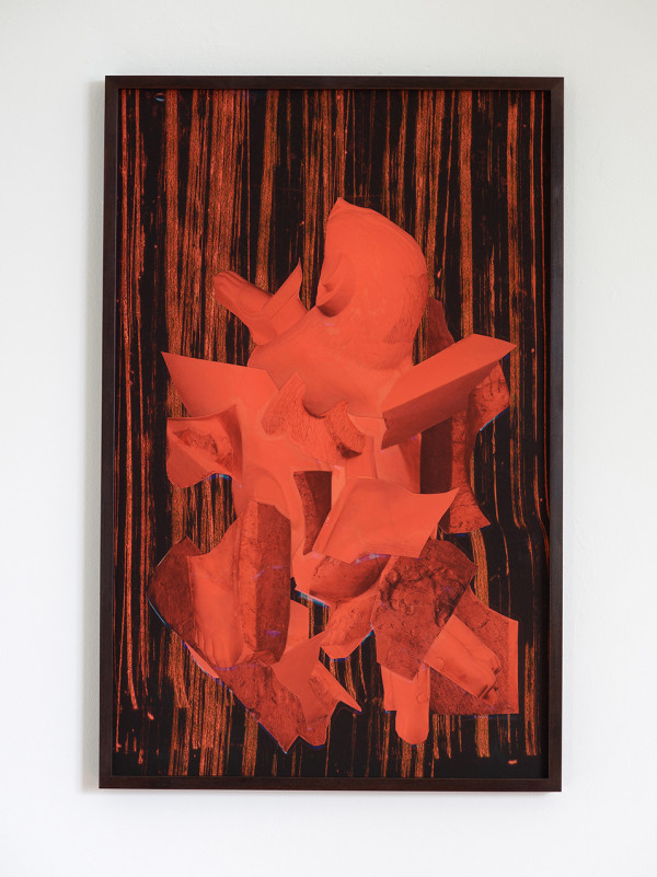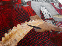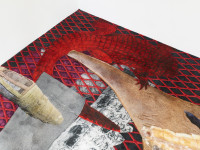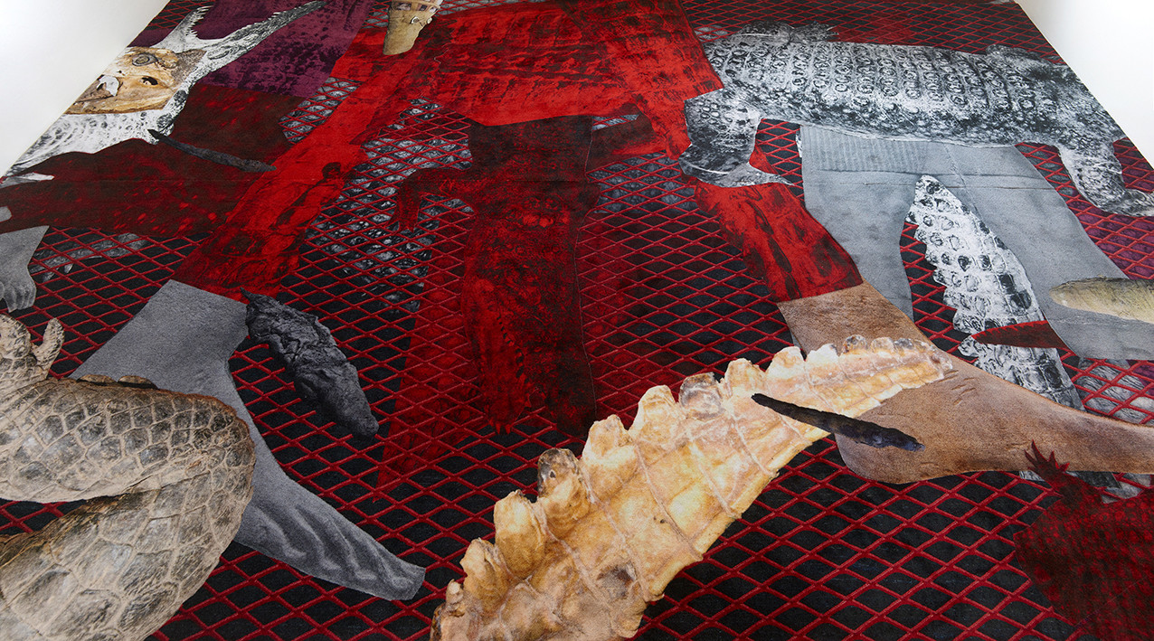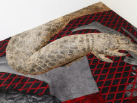 The four photos of the current show, Woman_1, Woman_3, Smoke and Flesh, all show the figure of the female pharaoh Hatshepsut. The question of gender roles is inherent in this history, for there is no female form of the word "pharaoh" in Egyptian, and the depictions of Hatshepsut are also predominantly androgynous. Using collage techniques, Nasseri "transports" this four-thousand-year-old sociopolitical stance to our present and constructs a new identity. The focus is on a hybrid figure that is neither clearly male nor female, but neutral and completely open to the new. This layering and superimposition of the most various temporal and narrative threads is continued in the site-specific carpet piece entitled "the one in the egg." Here, Nasseri analogously superimposes the symbolic motifs of crocodiles from four eras. The first layer shows living crocodiles that she photographed in Egypt, the second mummified crocodiles of the present which she found on her visits to Egyptian villages, the third mummified crocodiles from the time of the pharaohs, and the fourth layer is composed of fragments of a human figure, the Egyptian crocodile deity "Sobek". The motif of the mummy is, similar to the photograph, an index of memory. Donja Nasseri forges the temporal superimpositions to a hybrid unity, bringing into balance aspects of cultural closure and openness, of historical and personal history. She combines seemingly incompatible opposites to an intercommunicative union, ultimately the ideal of a society shaped by opposites.