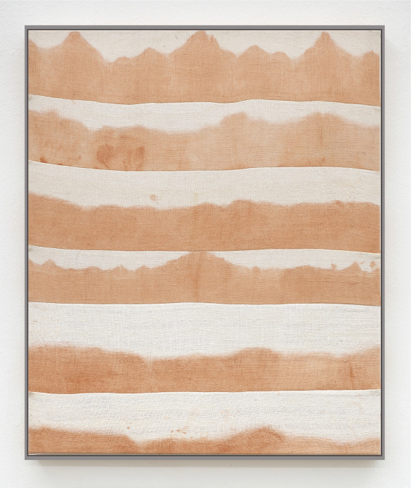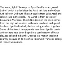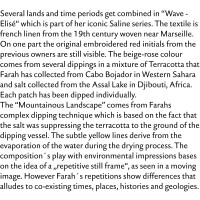 Several lands and time periods get combined in “Ravenna“ which is part of iconic series „Maps“. Composed in a strict Grid like pattern that reminds to the Grid of a map, this work combines multiple places, memories and working process related to of Ayan Farah´s travels around the world. Patches treated with mud from the Dead Sea, clay collected in Iceland, carob from Essouria in Marocco, fermented terracotta from Mexico and Italy, indian ink, or salt from the Assalt Lake Sea in Djibouti, rust that Ayan Farah gained by collecting metal objects around her house and the beach in Southeastern England, mixtures of clay and white chalk from the East Sussex Coast, marigold grown in Southeastern England and indigo grown in Stockholm Archipelago close to Farah´s parents home. This work is one of her major pieces including all aspects of Ayan Farah´s approach to art: the concept of co-existing times, places, histories and geologies.