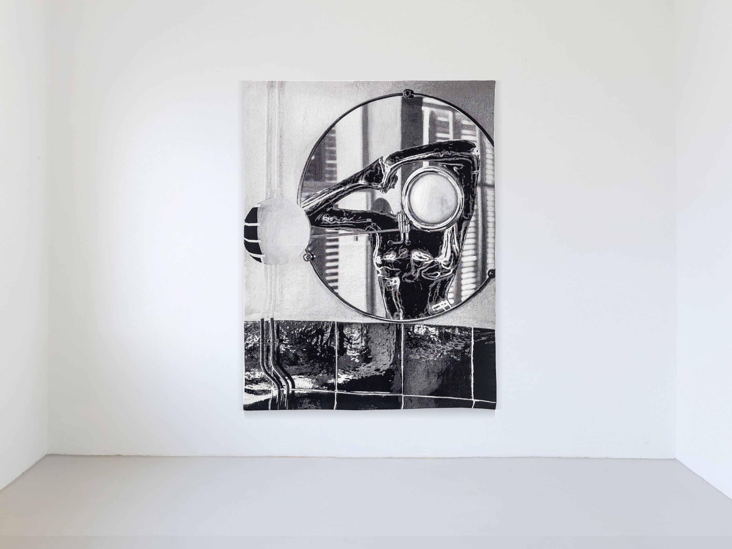 In Shannon Bool’s works the body becomes the central “area of the images”. Bool´s iconic new tapestry „Dawn“ combine the process of photography with digital image generation with the physical process of tapestry making in Jacquard technique. The motif is based on an imagery completely generated on the computer: a synthetic rendered figure, set in a modernist bathroom whose reflection seems to go on to infinity in the mirrors and tiles. The figurine is completely generated on the computer and plays with connotations what the human body and identity could be, whereas the modernist interior refers to the famous house E1027 designed by Eileen Gray in 1929. The extreme enlargement of the digital motif constructs an image rasterization that becomes part of the actually woven pattern. In this way, Shannon Bool’s tapestry constructs a paradoxical bodily experience between digital and real space which kind of „collapse“ within the psychological space of the beholder.