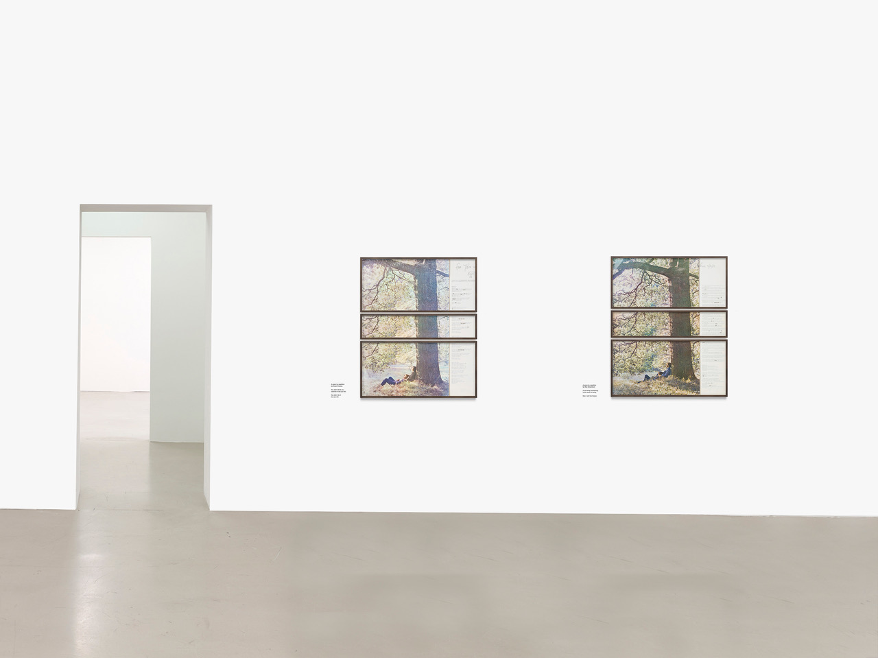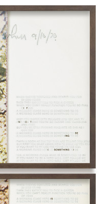 “A poem by repetition by Robert Creeley (John)” is closely related to the simultaneously produced piece “A poem by Repetition by Rae Amantrout (Yoko)”. Czech stages the solo albums by Yoko Ono and John Lennon, which were also recorded simultaneously in 1970. The original albums are already collector’s items, for although they contain different songs, the covers were staged almost identically. Apart from fine color differences, it is John Lennon who holds Yoko in his arms on Yoko Ono’s album, and Yoko who holds John in her arms on Lennon’s album. Czech stages the record by John Lennon on the inner sleeve on which the lyrics are printed. White overpainting lets the original lyrics of the songs “Mother” and “Hold On John” recede to the background, while words marked with black make Robert Creeley’s poem visible and readable. Yoko Ono’s record is also staged on the inner sleeve of John’s album, but with the songs “Working-class Hero” and “Isolation”, where reworkings and markings make the poem by Rae Armantrout visible and readable. In a pointed and poetic manner, both works use photographic, content-related and formal repetition to “narrate” the ineffable “plus” in the dialog of a romantic relationship.