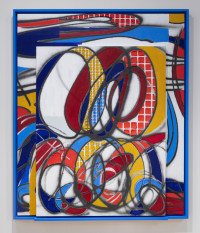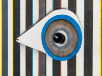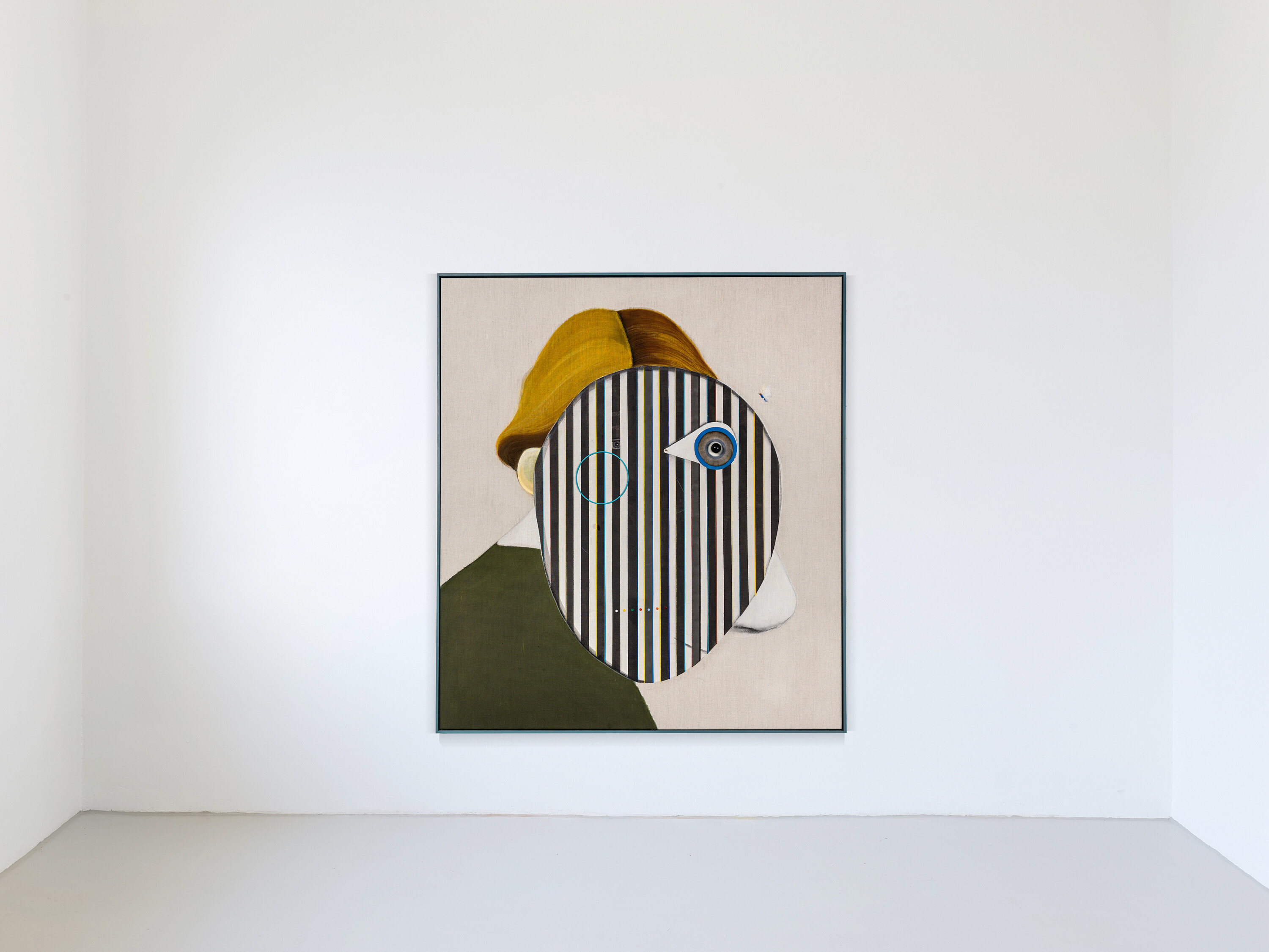 Matthias Bitzer´s new painting focus on a fine play with the dissolution of spatial and temporal orientation by combining fictional painting with real objects mounted on the canvas. However, and this makes his new works so exceptional, these real objects like balls and rings loose their original function and become abstract coordinates of new spatial realities. So what you see is a striking and at the same time subtle development of features of art historical aspects of New Realism and Abstract Modernism to a contemporary „NOW“. The motif combines and shifts several images of a portrait and spatial concepts. With a closer look, you see an eye shining through the flickering „background", whereas objects on the surface expand the painting to the real space.