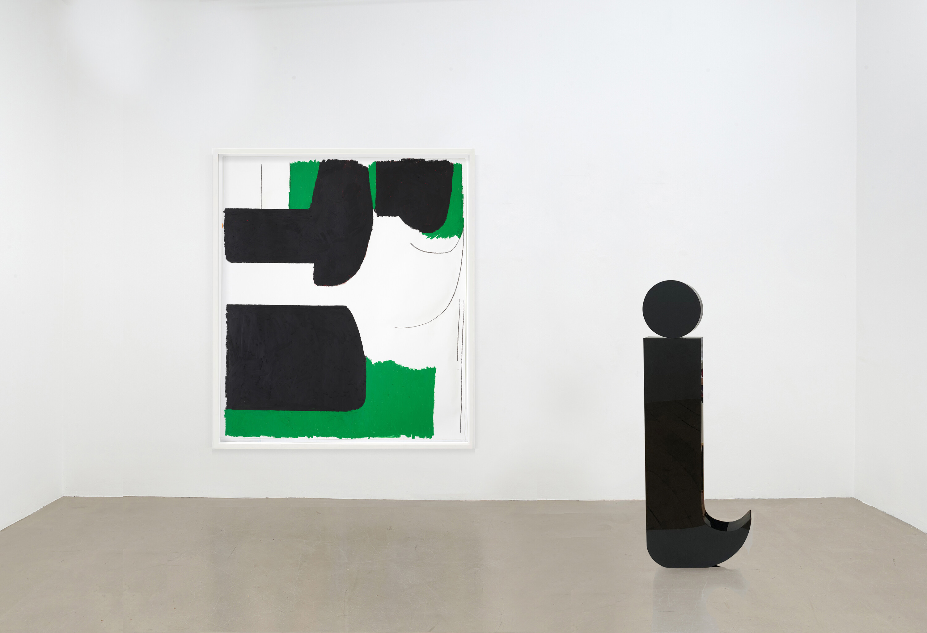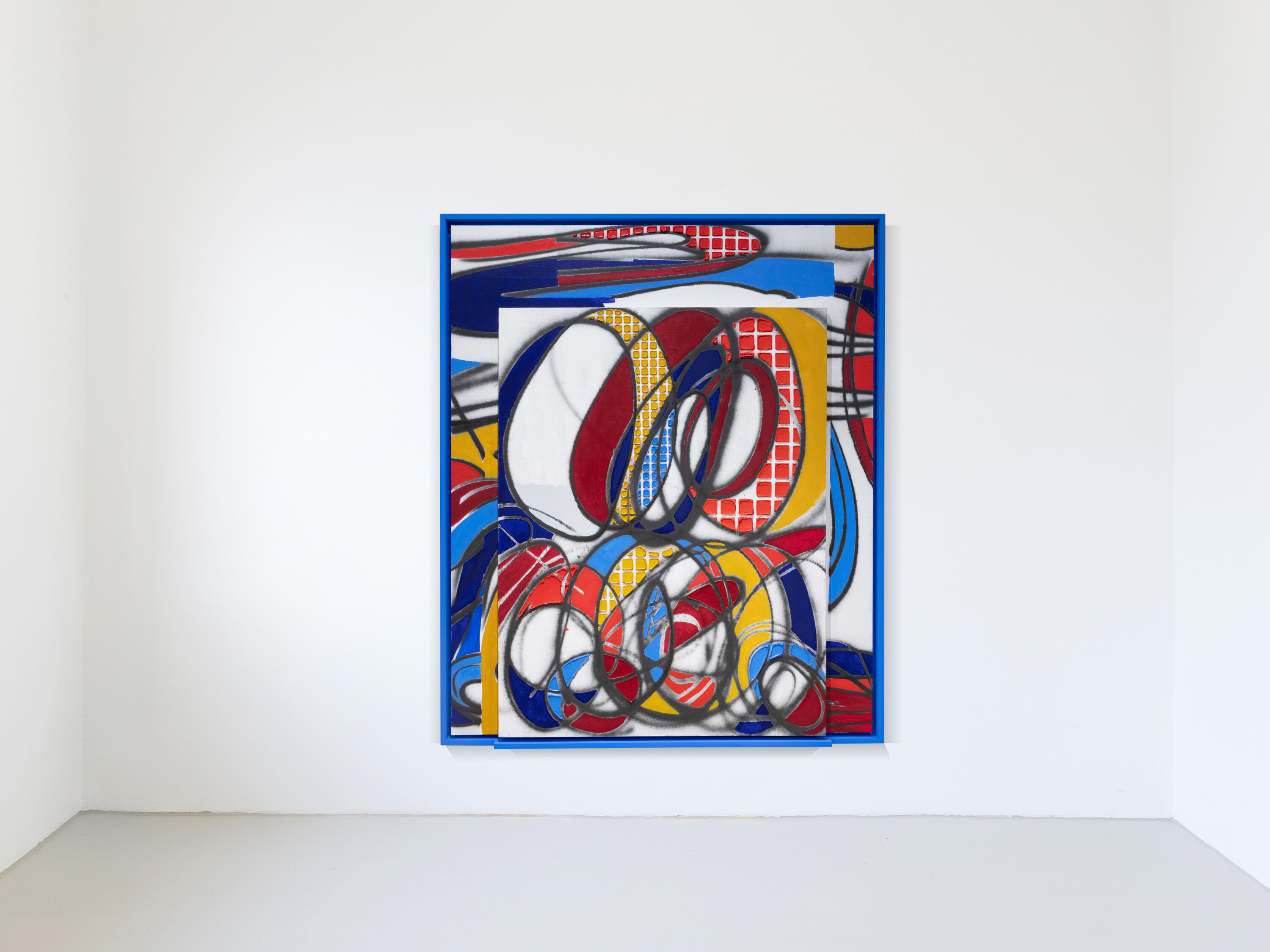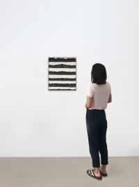 Keltie Ferris new large-format painting „FM/AM“ belongs to her series of so called „stacked paintings“ that started in 2019. This group of paintings literally extends painting to a relief like object by stacking one painting in parts on the other. The titel of Ferris´new painting „FM/AM“ refers to two kinds of radio channels and is a poetic hint to the sound and dancing like working process of spraying the black graphite lines which demands the whole body. „FM/AM“ creates a “physical contrast” between sprayed, brushed, and turpentine-obscured painting, on the one side, and relief-like elements consisting of marble dust mixed with paint, on the other. Ferris grasps painting as a personal index characterized by performative gender and body identities.