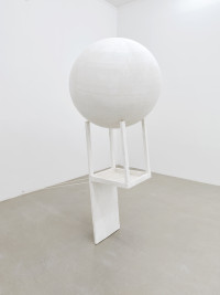 Inge Mahn's object „Balancing Ball “ from 2017 has been exhibited at her solo exhibition at Kunstverein Braunschweig in the same year and belongs to one of her most important body of works, the “Stühle” [“Chairs”]. They distinctly represent three basic principles of Inge Mahn’s artistic practice: First, “confronting the burden” (physically and psychologically), second, “natural laws are to be equated with the laws of interpersonal relationships”, and third, “seek the legitimation of art in the social sphere”. In this sense “Balancierende Kugel“ deals with the act of burden sharing, of supporting and being supported. Comedy and tragedy lie close to each other in Mahn’s oeuvre, like in real life. The artist sees her sculptures as “stops” in between; contradictions are not disturbances but complements.