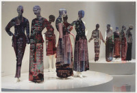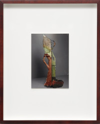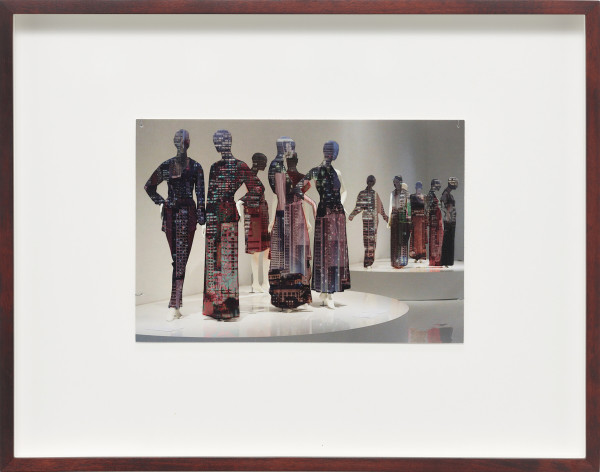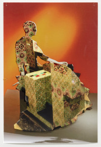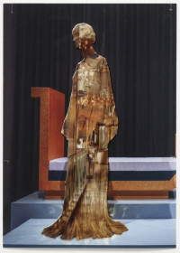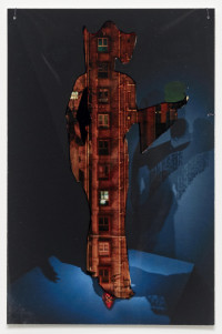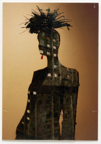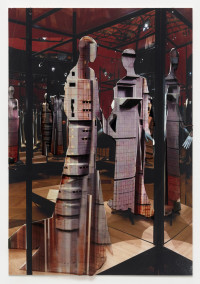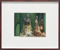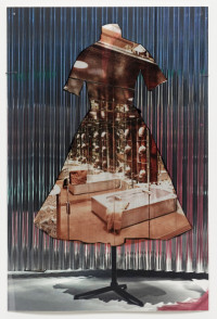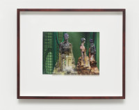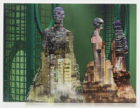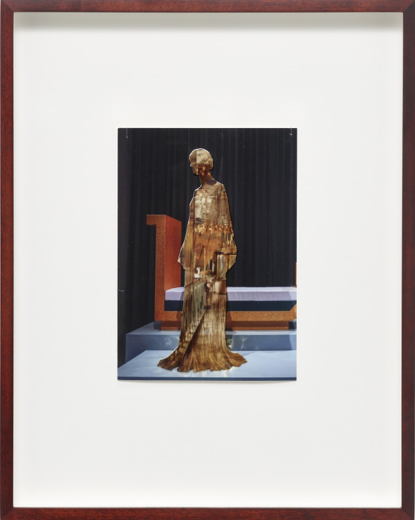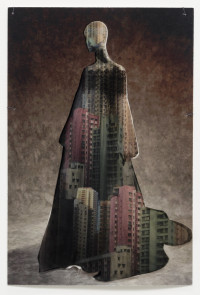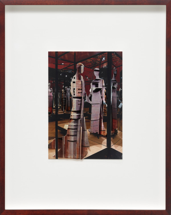The interaction between space, body and identity is impressively continued by ten new photo collages. The smallformat works consist of superimposed photographic prints on baryta paper and foil, making the figurines with iconic architectures, such as the film set of “Blade Runner”, the Shangri La Hotel in Hong Kong, the skyline of Manila, or the interior design of Mollino, unique copies. The figurines are depictions taken from exhibitions by the fashion houses Dior, Oscar de la Renta, Yves Saint Laurent, or Thierry Mugler. The minimal, idealized “bodies” are already ideals of an urban culture in which “self-design” is a firm component. As “Madonnas of consumption”, the illusionistic bodies collapse with the architecture to create the vision of a multitude of identities.