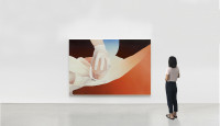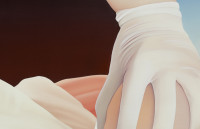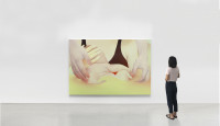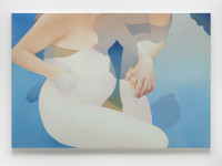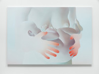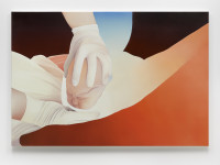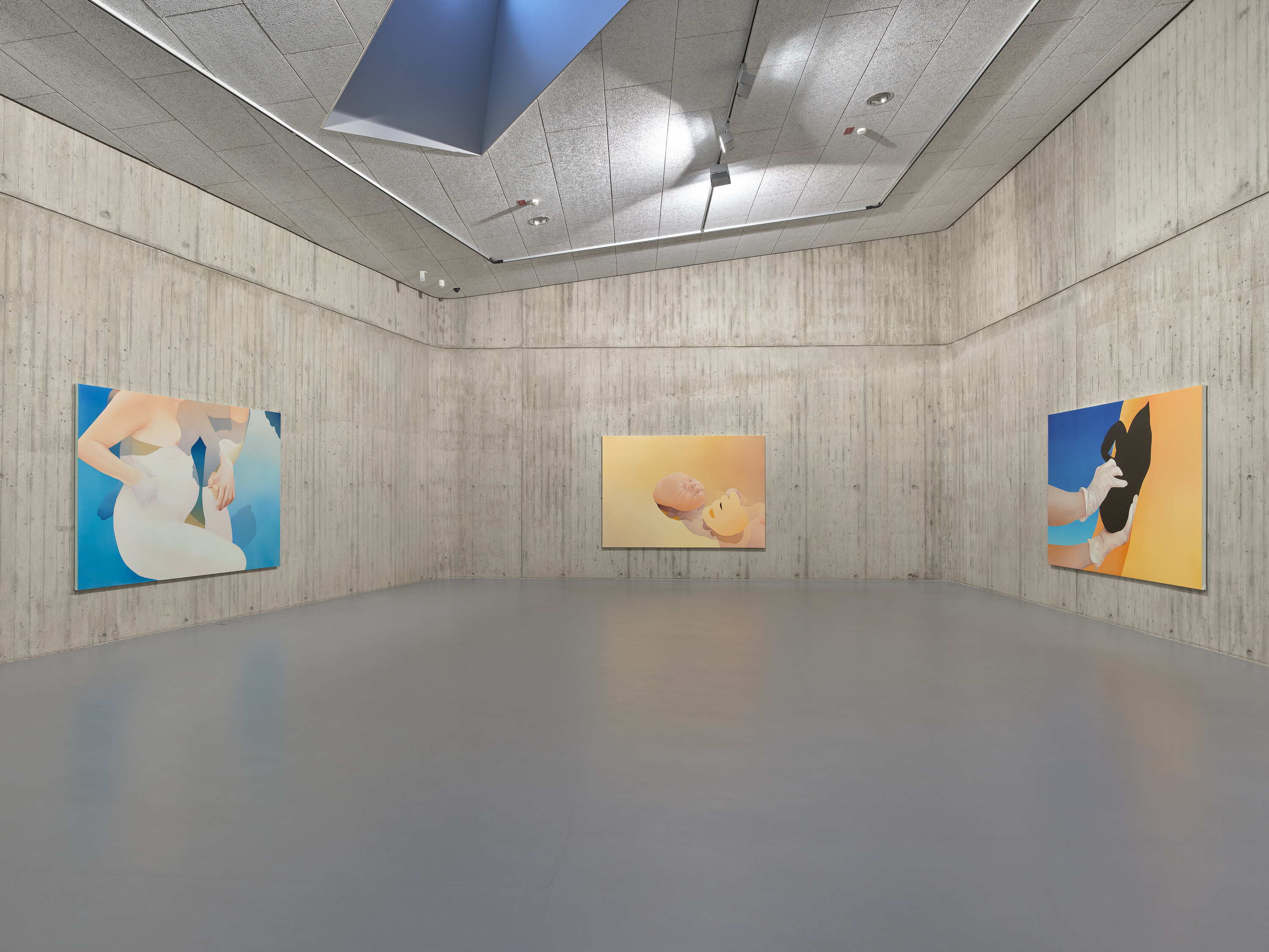 Two bodies merge under the surface of the water, a baby’s head floats and is held. In one of the paintings, the irresistible surface of medical gloves is draped over two hands reaching for a baby’s clear head. His head is the center of the image and tension. Two thighs open in color and in turn become abstract mountains, patches of color forming a landscape. Warm brown and orange color gradients juxtapose blue and white. What happens here is clear, yet neither brutal nor voyeuristic. Although the viewer:s gaze is an outsider one, the painted formation nevertheless speaks a universal language. Greven combines in her new series of works the abstract and the explicit, infinite vastness and the smallest beginning.